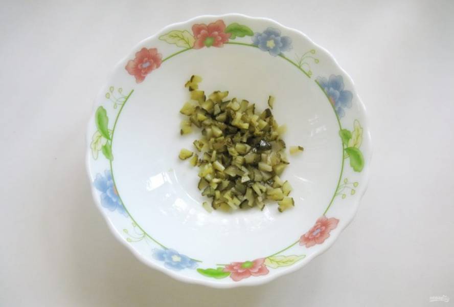 Один крупный маринованный огурец мелко нарежьте и выложите в салатник.