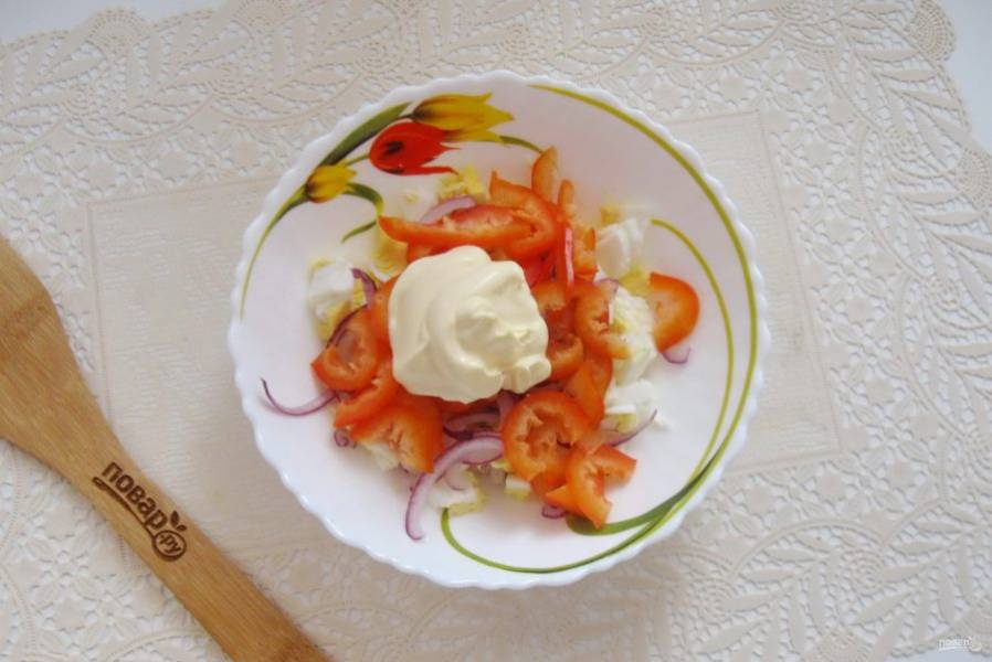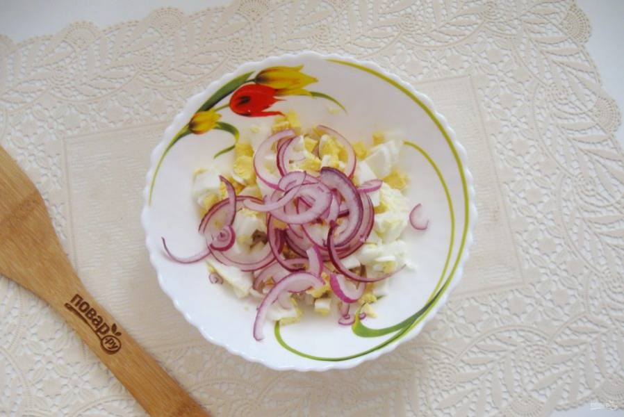 Яйца сварите вкрутую, охладите, очистите и мелко нарежьте. Добавьте в салат.