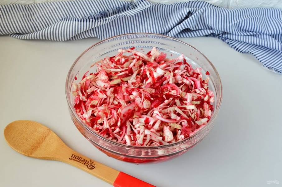 Свеклу снимите с огня через 35 минут, залейте ледяной водой, остудите, снимите кожуру и натрите на крупной терке. Выложите в большую миску к капусте и луку.