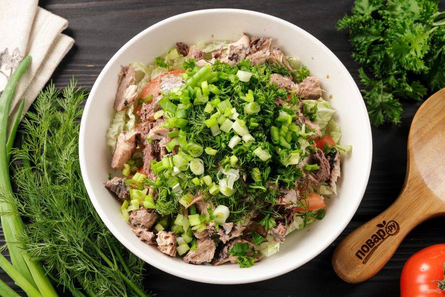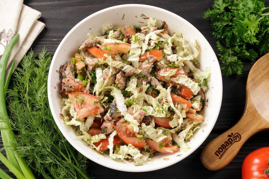 Перемешайте. Салат с капустой, тунцом и помидорами готов.