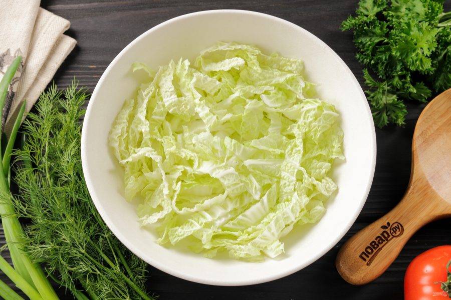 Листья пекинской капусты промойте, обсушите и нарежьте полосками.