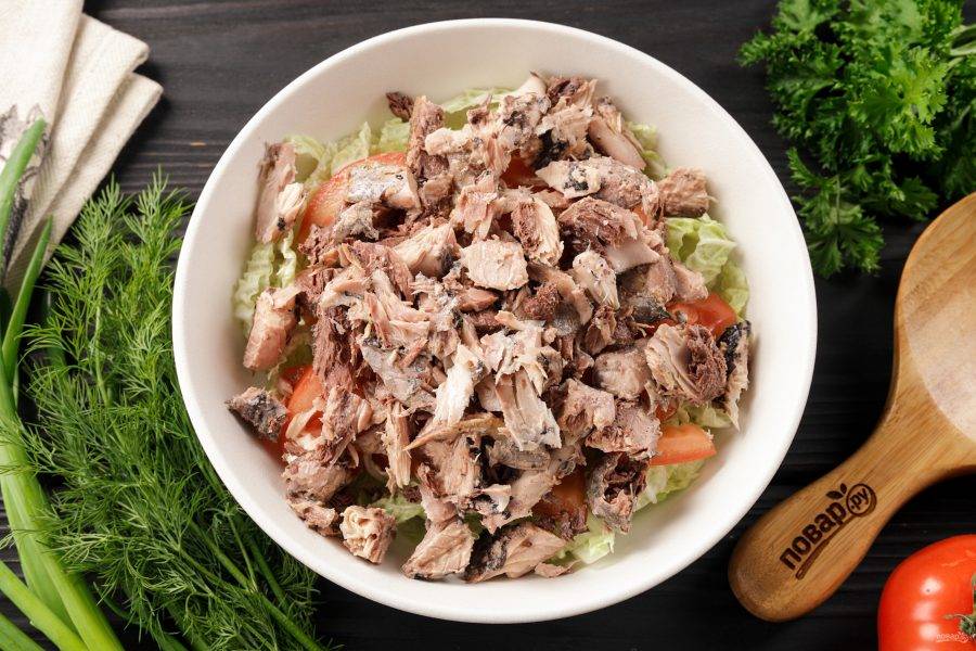 С тунца слейте жидкость и добавьте в салатник, предварительно размяв вилкой.