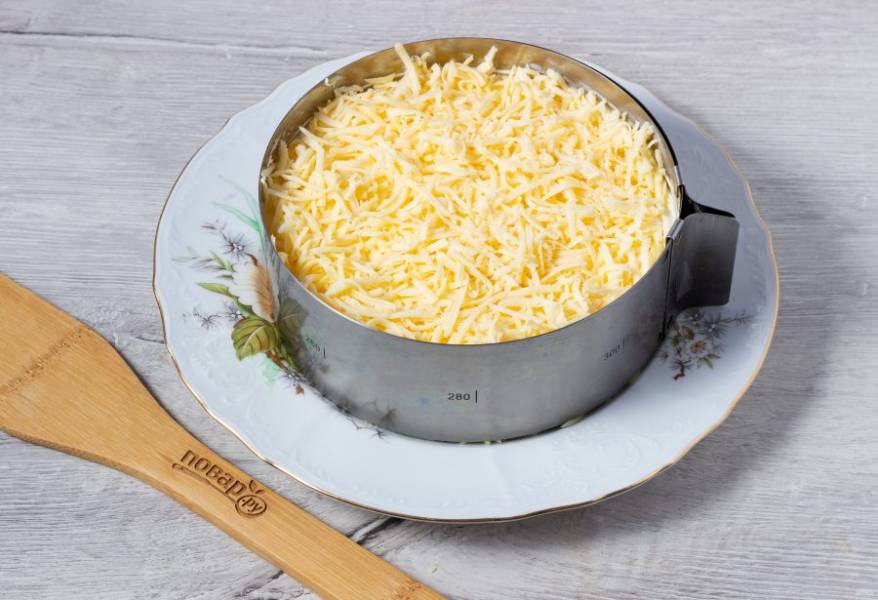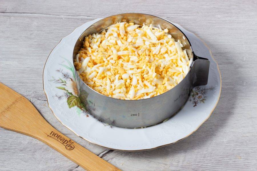 Четвертый слой - натертые на крупной терке яйца и майонез.