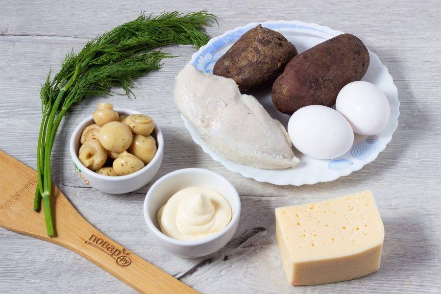 Подготовьте все необходимые ингредиенты. Заранее отдельно отварите в подсоленной воде картофель, грудку и яйца.
