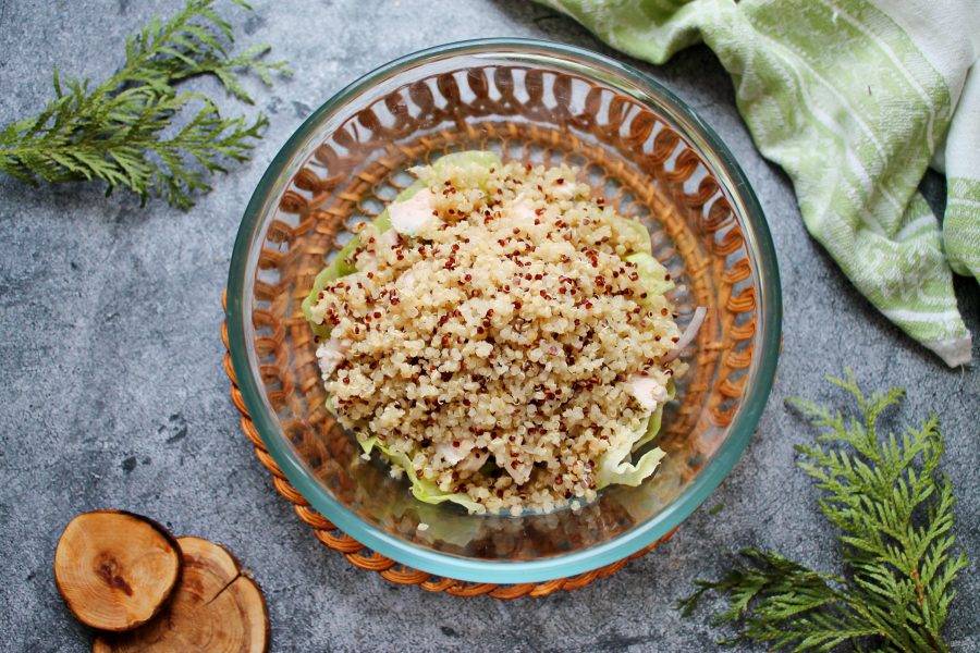 Киноа сполосните и залейте холодной водой. Поставьте кастрюлю с киноа на медленный огонь и варите после закипания 15-20 минут. Киноа должно приготовиться, а вода полностью впитаться. Снимите кастрюлю с огня и полностью остудите.