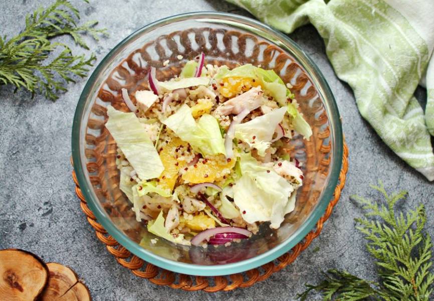Подготовьте все необходимые ингредиенты для приготовления салата с киноа, курицей и апельсинами. Апельсин тщательно вымойте в горячей воде, айсберг сполосните и обсушите.
