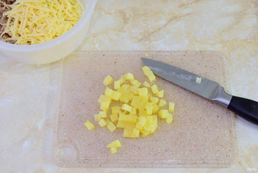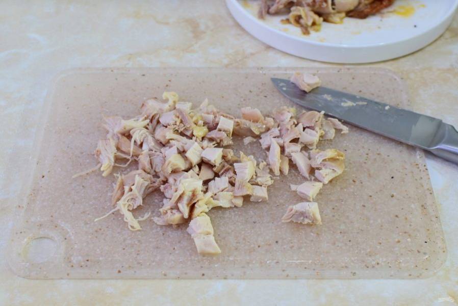 Куриное мясо отделите от костей и нарежьте кубиками.