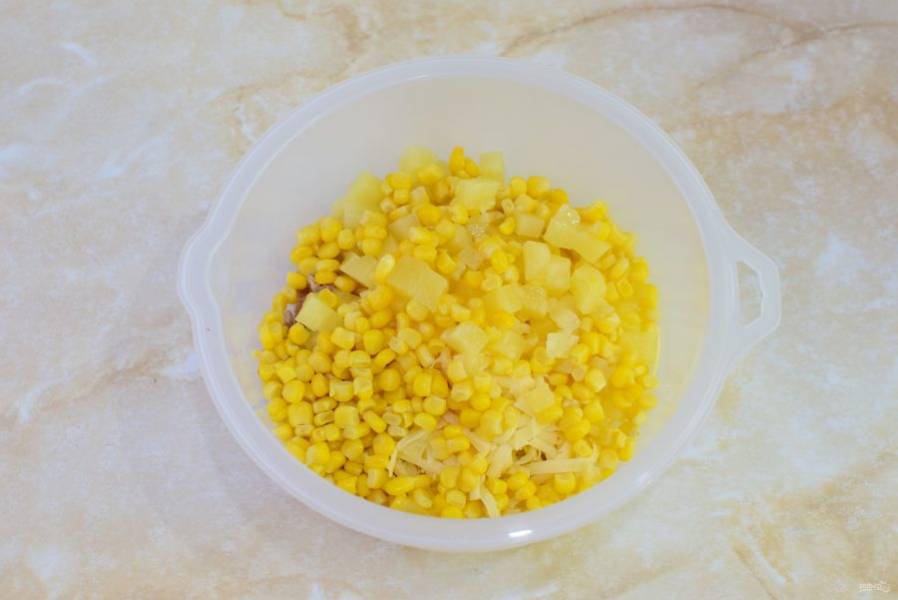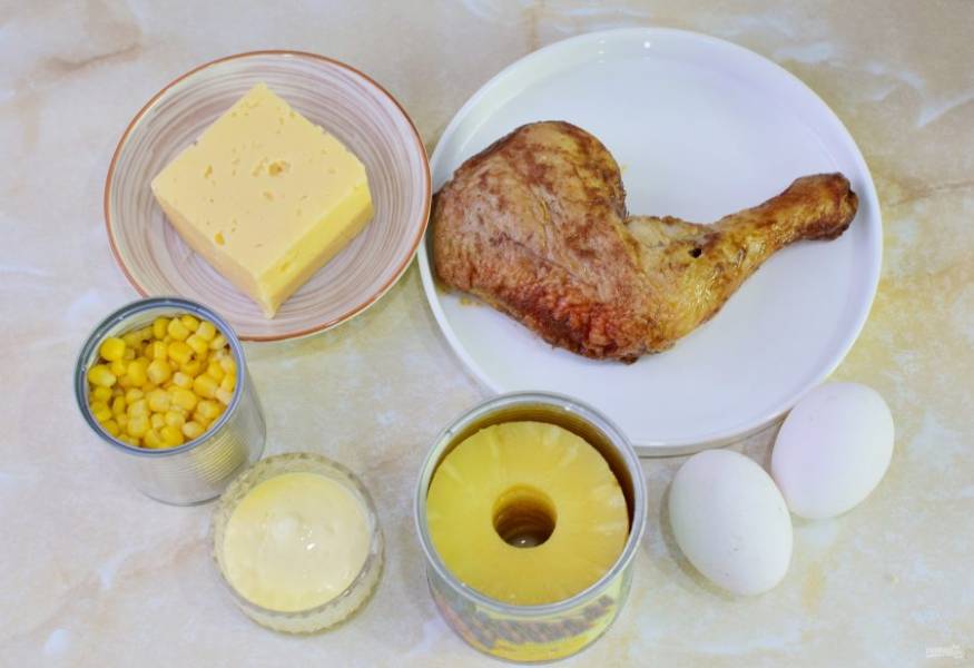 Салат с копченой курицей, ананасом, сыром и кукурузой