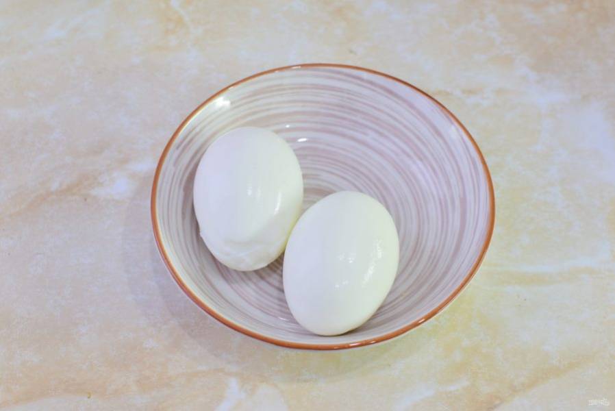Заранее отварите яйца в кипящей воде около 7-8 минут. Затем охладите их в холодной воде и очистите от скорлупы.