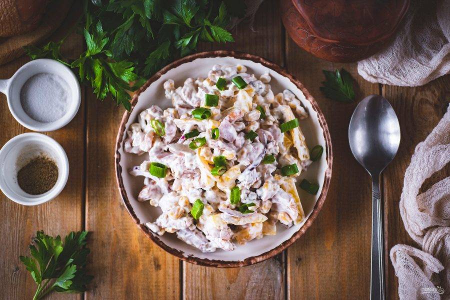 Разложите готовый салат по порционным тарелкам, можно чуть присыпать мелко порубленным зеленым луком, и подавайте к столу. Приятного аппетита!