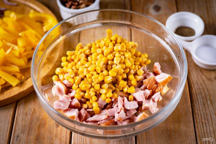 В просторную миску выложите нарезанное копченое куриное мясо, добавьте консервированную кукурузу.