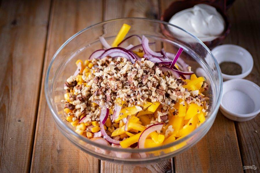Измельченные орехи добавьте в миску к салату.