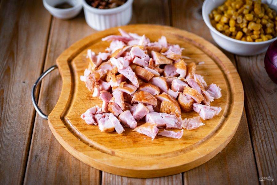 Срежьте все куриное копченое мясо с костей и нарежьте его небольшими кубиками.