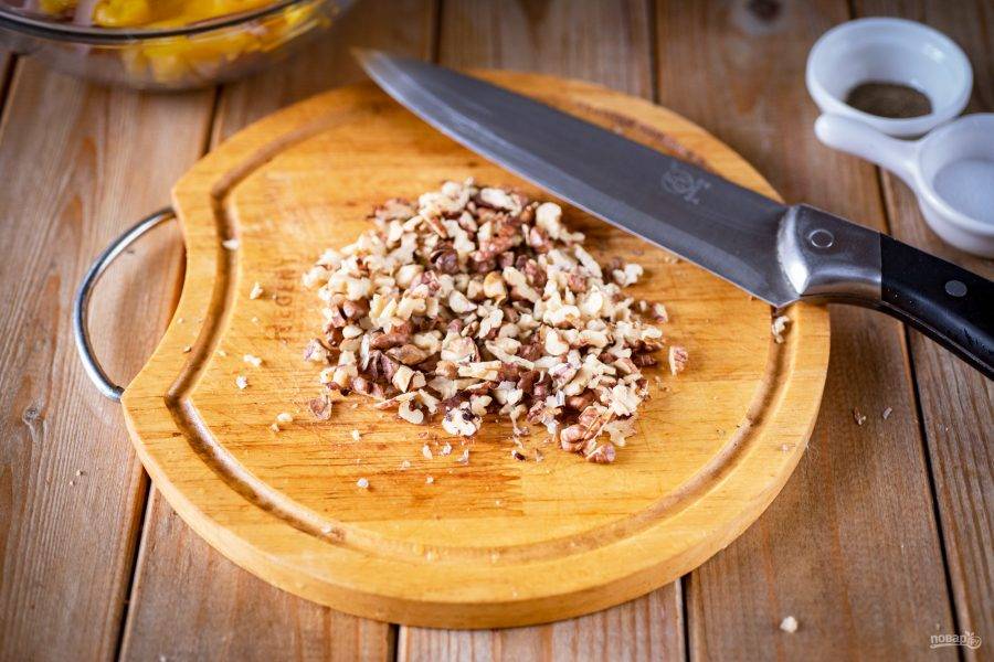 Грецкие орехи мелко порубите острым ножом.