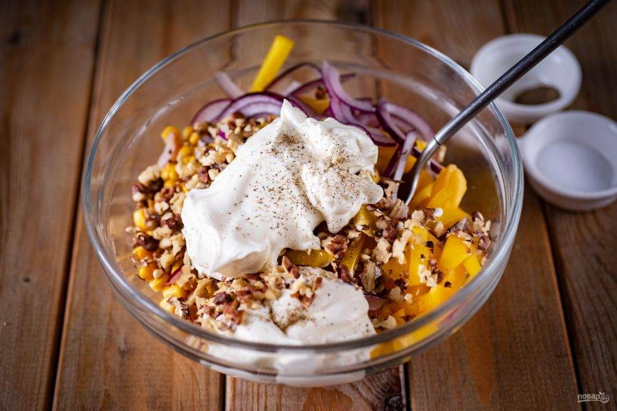 Добавьте майонез и черный молотый перец. Перемешайте все до полного соединения ингредиентов и попробуйте на соль, тут же добавьте, если надо, соль по вкусу и еще раз перемешайте.