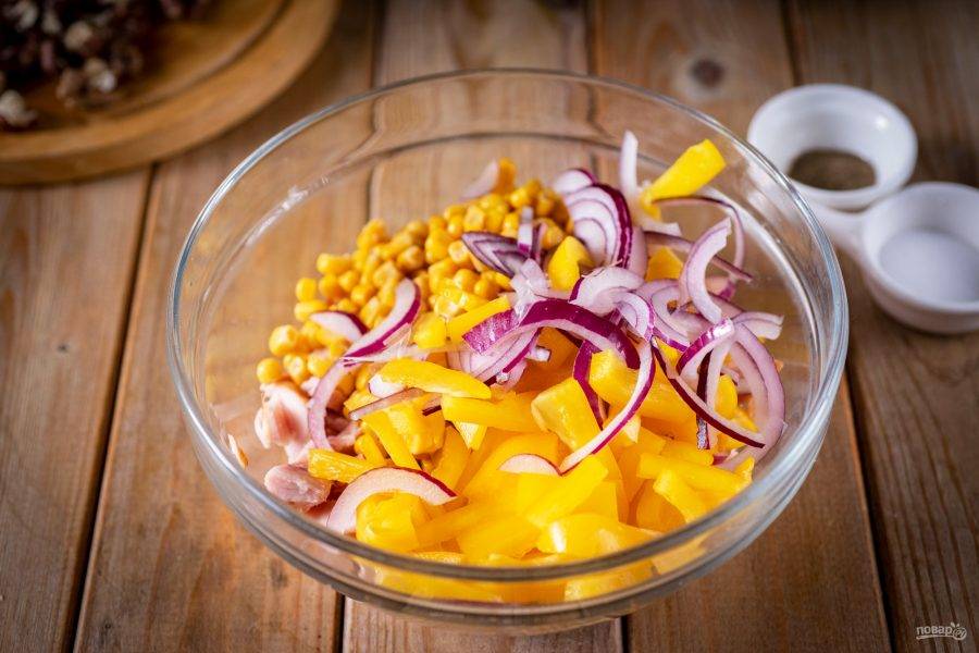 Салат с копченой курицей, болгарским перцем и кукурузой