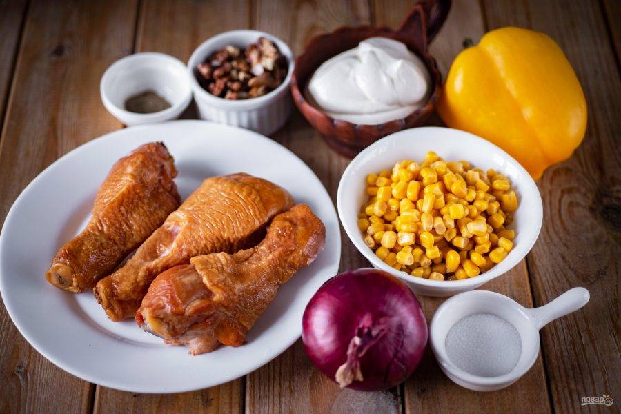 Предлагаю приготовить вкуснейший салат из копченой курицы, перца и кукурузы — отличный вариант блюда как для праздничного стола, так и для повседневной трапезы.