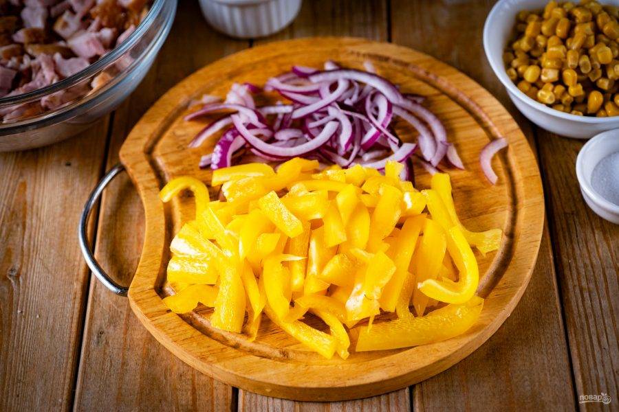 Почистите перец от семян и помойте. Мякоть перца нарежьте соломкой. Лук фиолетовый также почистите, помойте и нарежьте тонкими полукольцами.