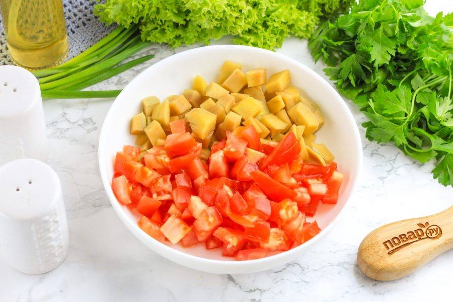 Половину манго очистите от кожуры и нарежьте мелкими кубиками. Точно так же нарежьте промытые помидоры, предварительно вырезав из них зеленые сердцевинки. Высыпьте нарезки в салатник.