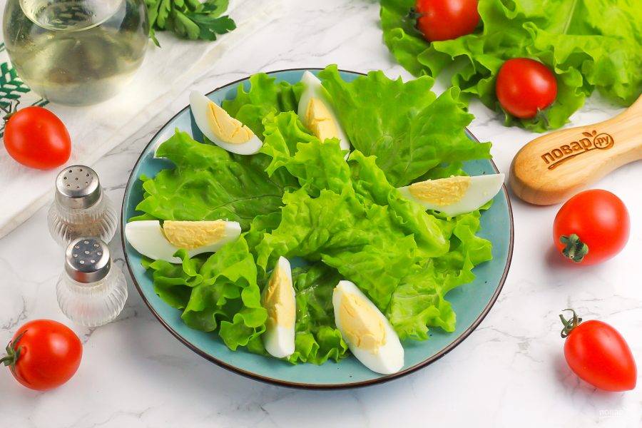 Очистите куриные яйца от скорлупы и промойте в воде. Нарежьте на четвертинки и выложите между листьев салата на тарелку.