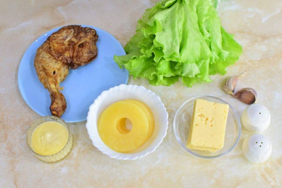 Для приготовления салата подготовьте необходимые ингредиенты. Из ананасов слейте сок. Очистите пару зубчиков чеснока.