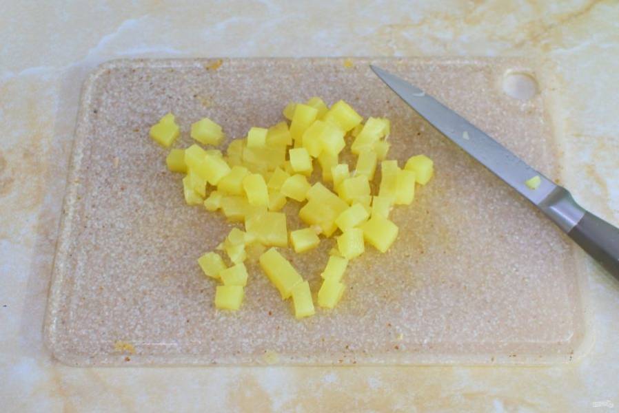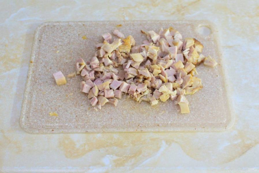 Куриное мясо отделите от костей и нарежьте кубиками.