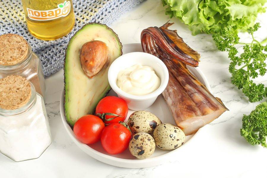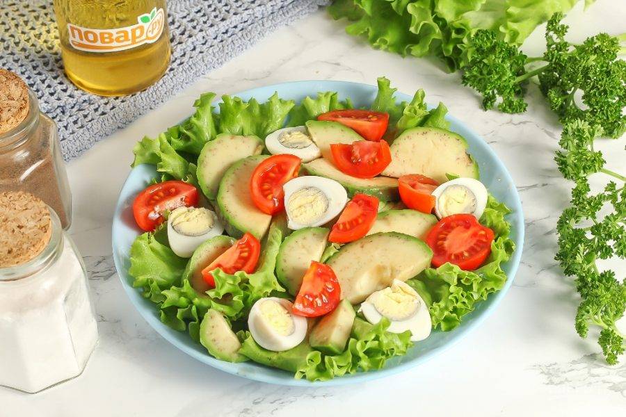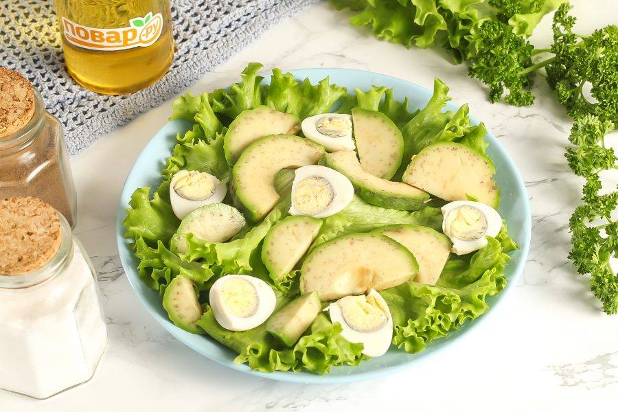 Промойте листья салата и стряхните лишнюю влагу. Выложите их на тарелку. Разрежьте отварные перепелиные яйца пополам, а помидоры черри на четвертинки. Половинку авокадо очистите от кожуры и нарежьте ломтиками. Добавьте обе нарезки в тарелку.
