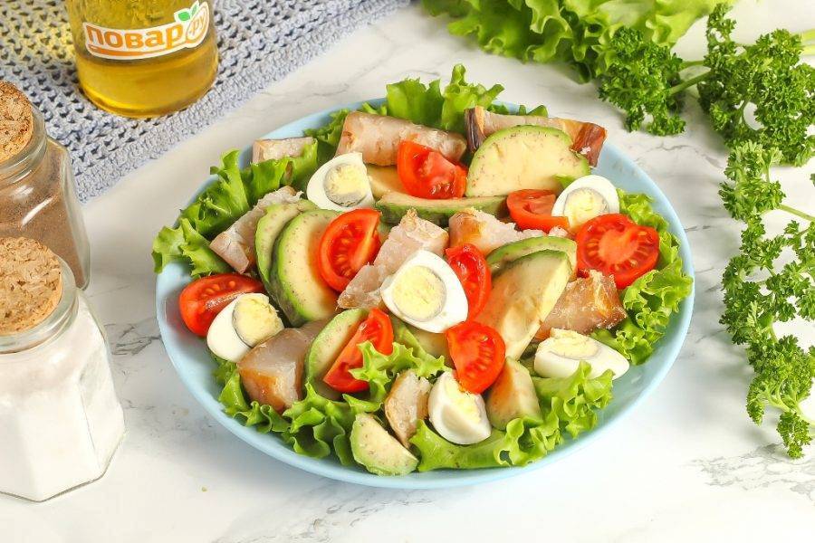 Ароматный и аппетитный салат с копченой рыбой можно приготовить как в качестве аперитива перед основным блюдом, так и для перекуса. Подавайте блюдо с бокалом охлажденного белого вина.