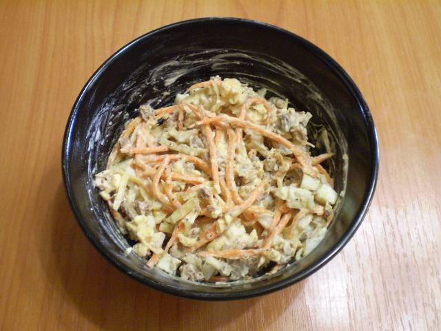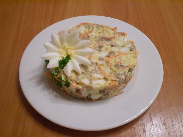 Салат с печенью и морковью - это недорогой, вкусный и легкий в приготовлении салат. А еще он очень сытный и полезный, так что - обязательно берите на вооружение!