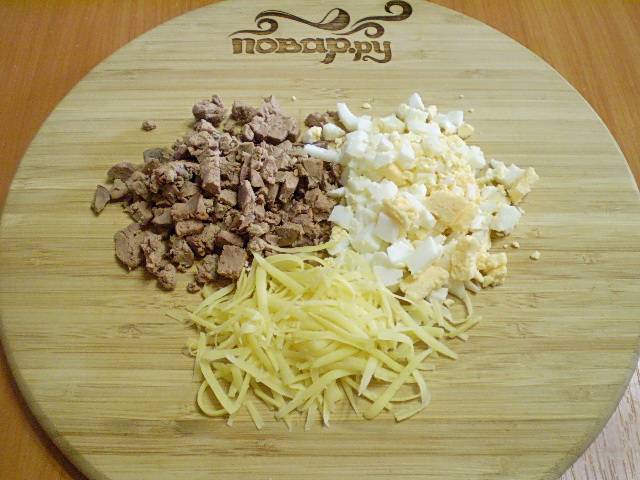 Печень и яйца порежьте небольшими кубиками. Сыр потрите на крупной терке.