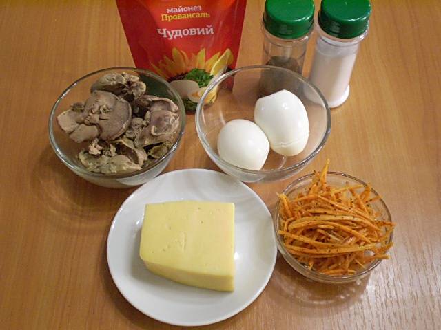 Для этого салата понадобится куриная или индюшиная печень, а также морковь корейская домашнего приготовления или магазинная.