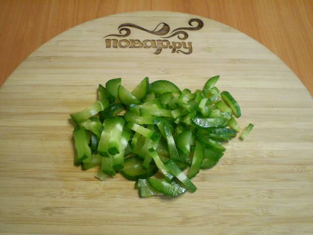 Порежьте соломкой огурец.