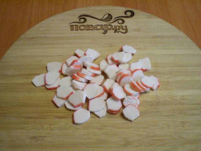 Крабовые палочки порежьте колечками или кубиками.