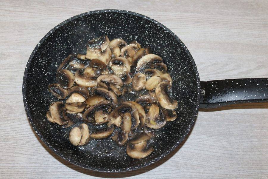 Шампиньоны нарежьте дольками, обжарьте в разогретой сковороде с добавлением подсолнечного масла. Слегка посолите.