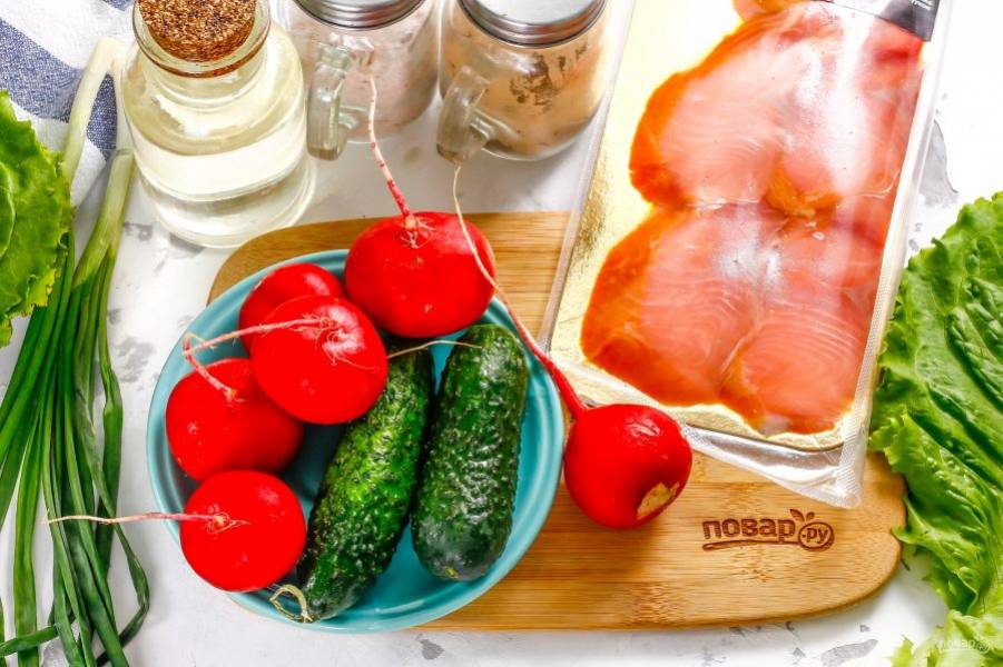 Подготовьте указанные ингредиенты. Слабосоленую красную рыбу приобретите в магазине или засолите в домашних условиях сами.