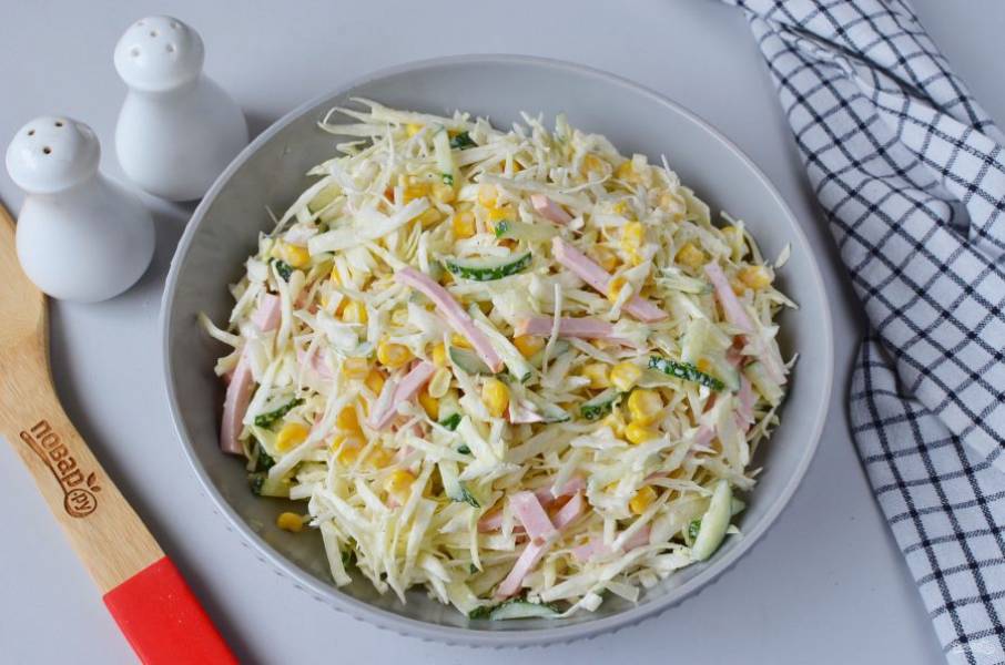 Салат сочетает в себе много разнообразных вкусов. В основе салата капуста и морковь, но благодаря кукурузе и колбасе салат получается сытным. Для заправки можно использовать сметану с горчицей.