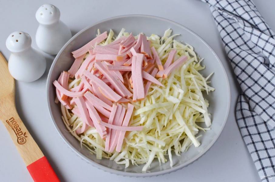 Порежьте колбасу соломкой. Добавьте в салатник к капусте.