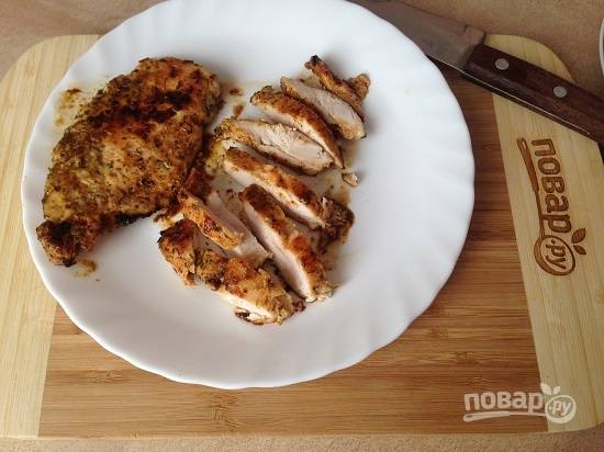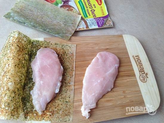 3. Куриное филе разрежем на две части, посыпаем солью, перцем и специями и обжарим до готовности. Я воспользовалась пергаментом со специями.