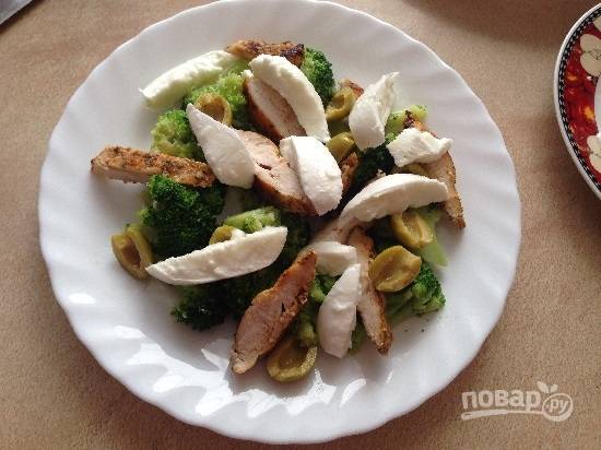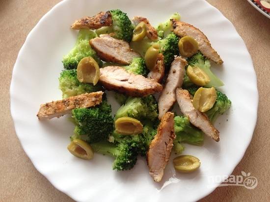 7. Выкладываем на тарелку брокколи и кусочки курицы. Добавляем оливки.