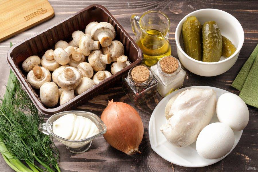 Салат с курицей, грибами и маринованными огурцами готов. Приятного аппетита!