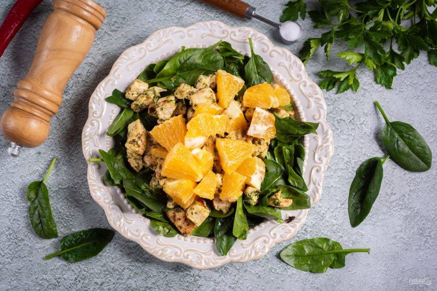 Теперь соберите салатик: на плоскую тарелку выложите листья шпината, поверх выложите куриные кусочки и поверх выложите апельсин, посолите, попробуйте и, если необходимо, добавьте еще черный молотый перец. Тут же подавайте готовый салат к столу.