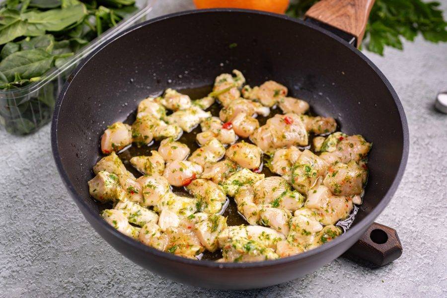 Затем переложите замаринованные кусочки курицы на сковороду и обжарьте со всех сторон на среднем огне в оливковом масле (из маринада), помешивая лопаткой, до появления легкой золотистой корочки.