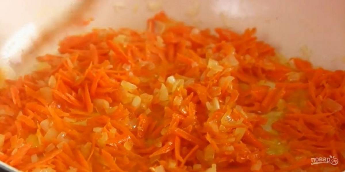 1. Лук нарежьте небольшими кубиками, морковь натрите на крупной терке. Обжарьте на растительном масле до мягкости лук, затем добавьте морковь.