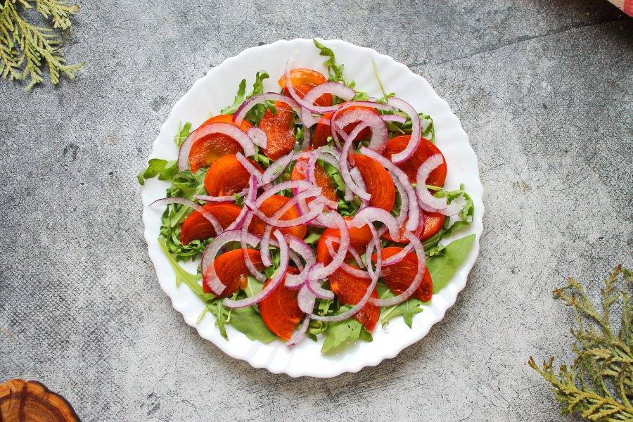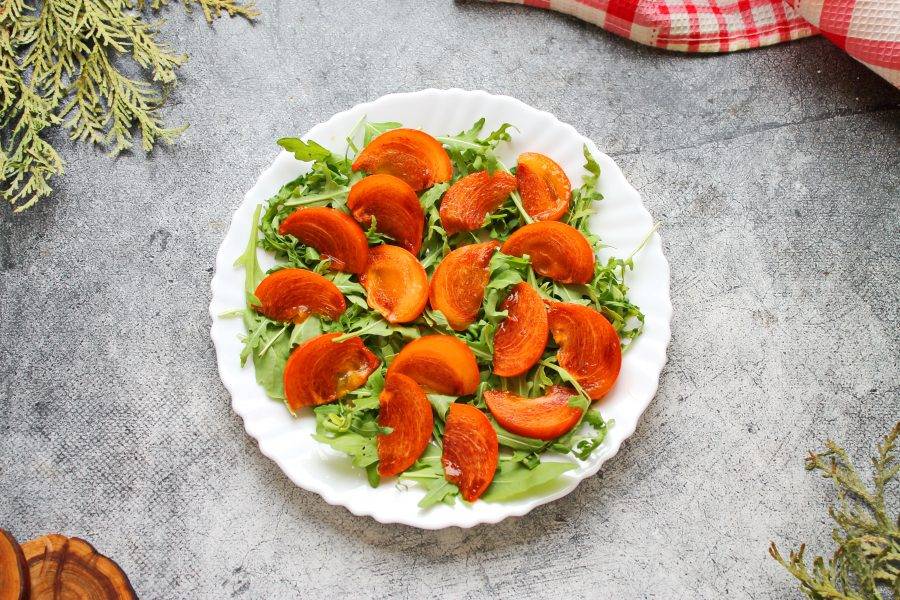 На сервировочном блюде разложите руколу. Хурму порежьте на дольки, удаляя косточки, разложите на зелень.