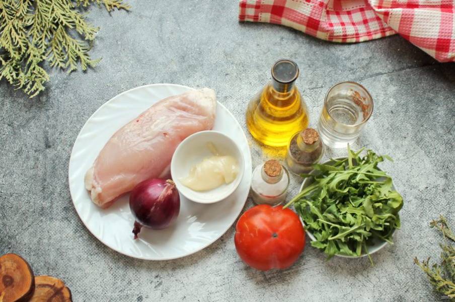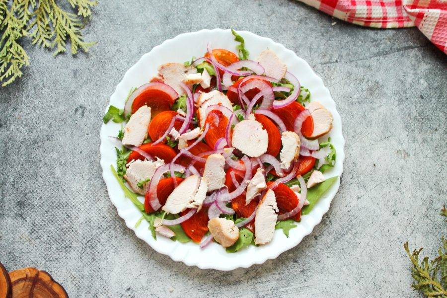 Подготовьте все необходимые ингредиенты для приготовления салата с курицей и хурмой. Лук почистите, сполосните, хурму вымойте и вытрите. Руколу переберите, сполосните и обсушите.