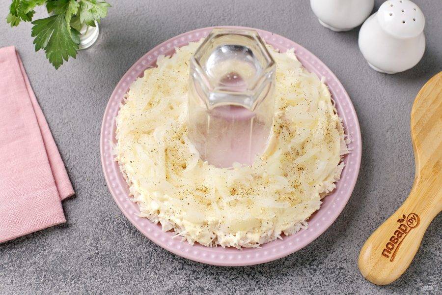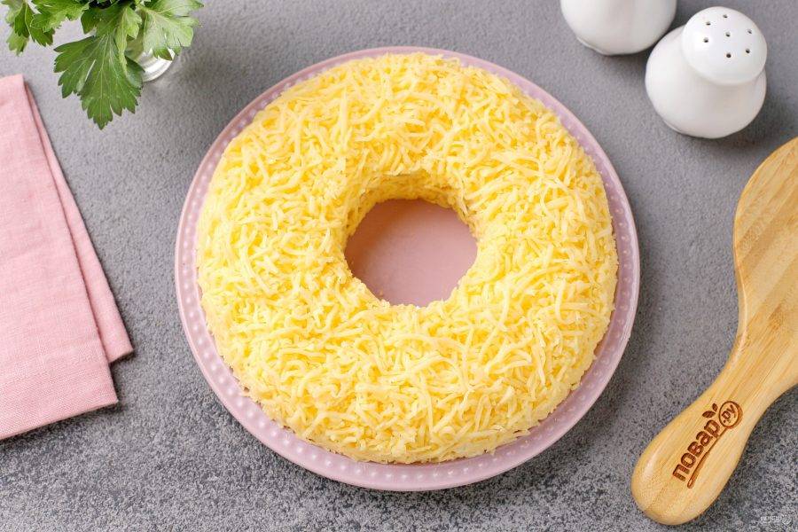 И последним слоем, убрав стакан, выложите тёртый сыр.