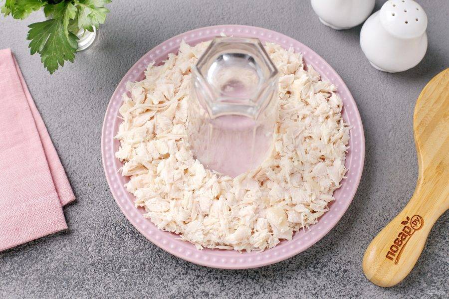 Салат предлагаю сделать в виде кольца, для этого перед приготовлением поставьте на тарелку перевёрнутый стакан. В конце его просто извлеките. Все слои смазываем майонезом, соль и перец добавляем по вкусу. Первый слой — нарезанное куриное филе.