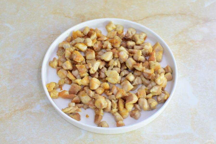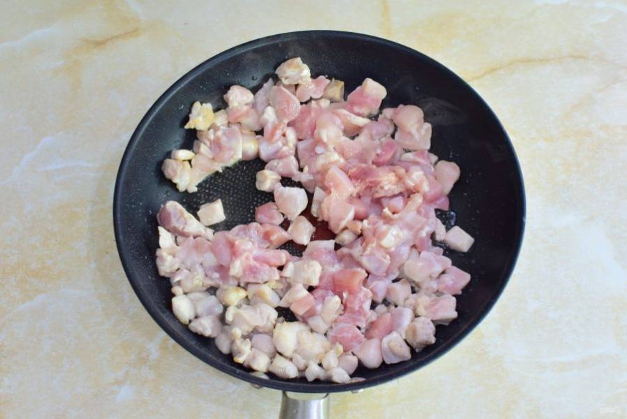 Куриное мясо нарежьте на небольшие кусочки и обжарьте до готовности 15-20 минут. По вкусу добавьте соль и специи.