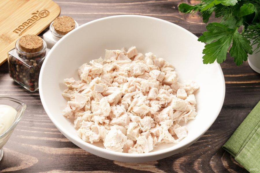 Нарежьте грудку небольшими кусочками и переложите в глубокую миску.