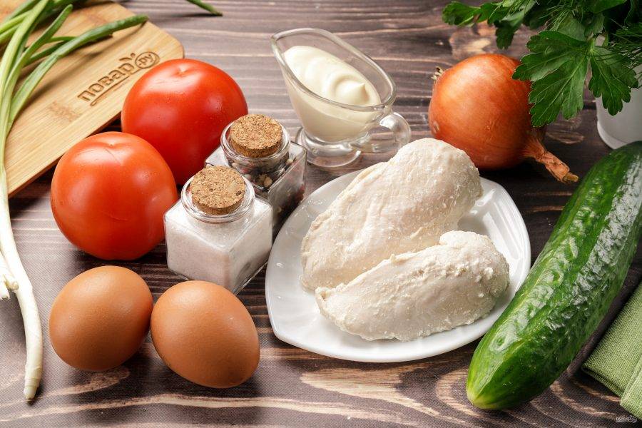Подготовьте все ингредиенты. Яйца отварите и остудите. Грудку так же лучше отварить заранее и оставить остывать в бульоне. Свежую зелень берите ту, какая вам больше нравится, у меня — петрушка, укроп и зелёный лук.